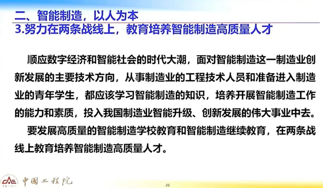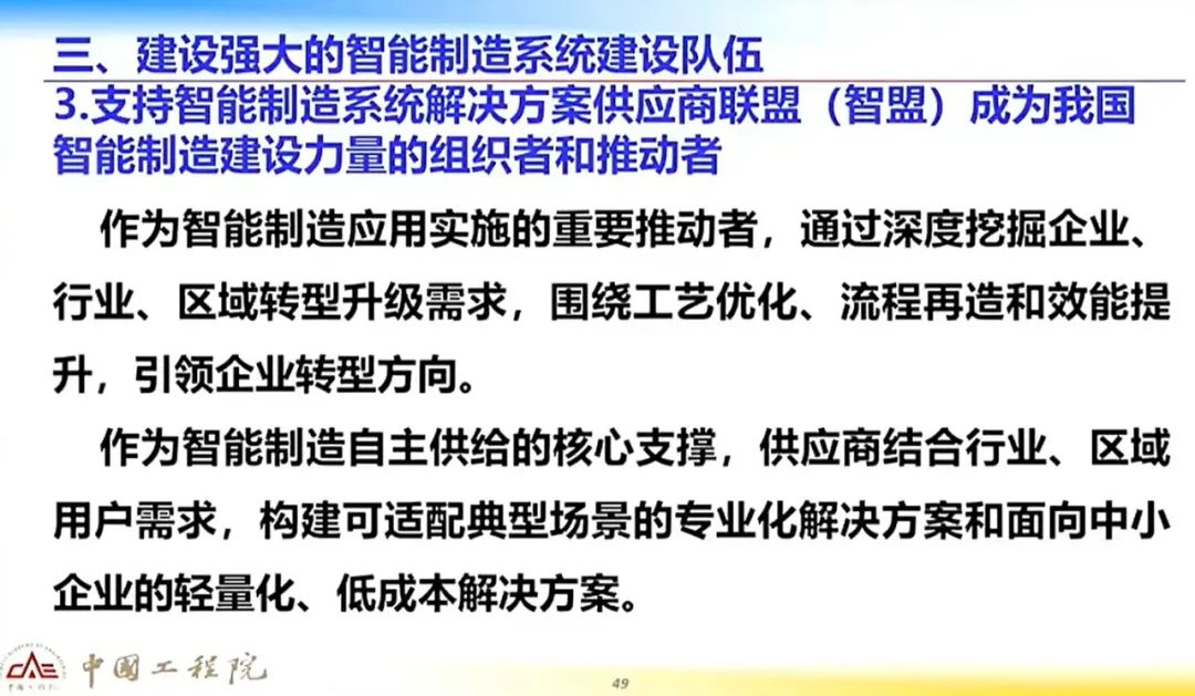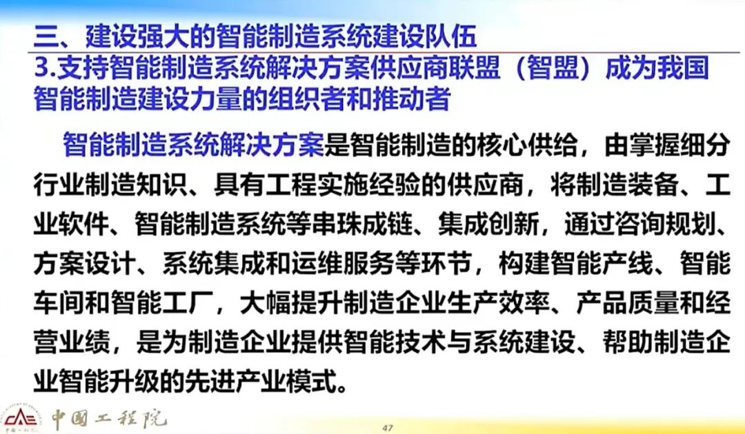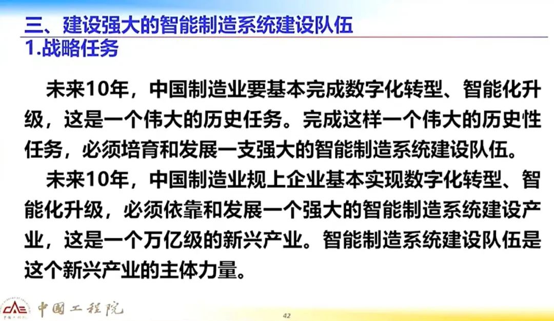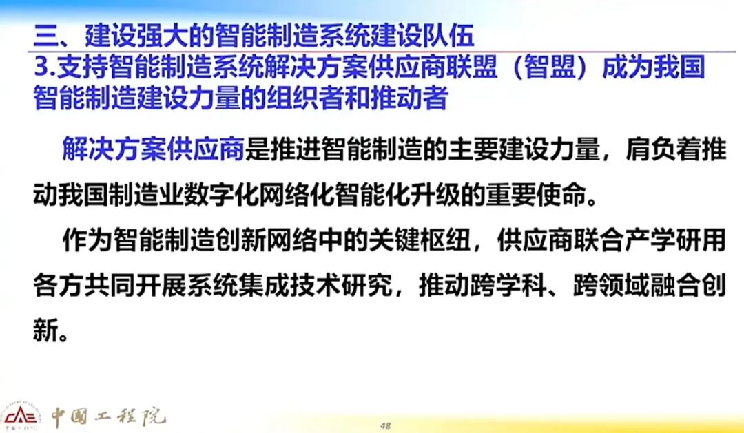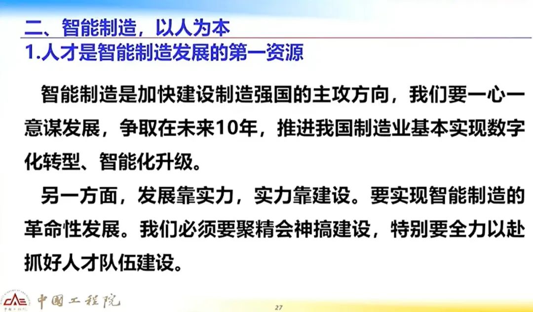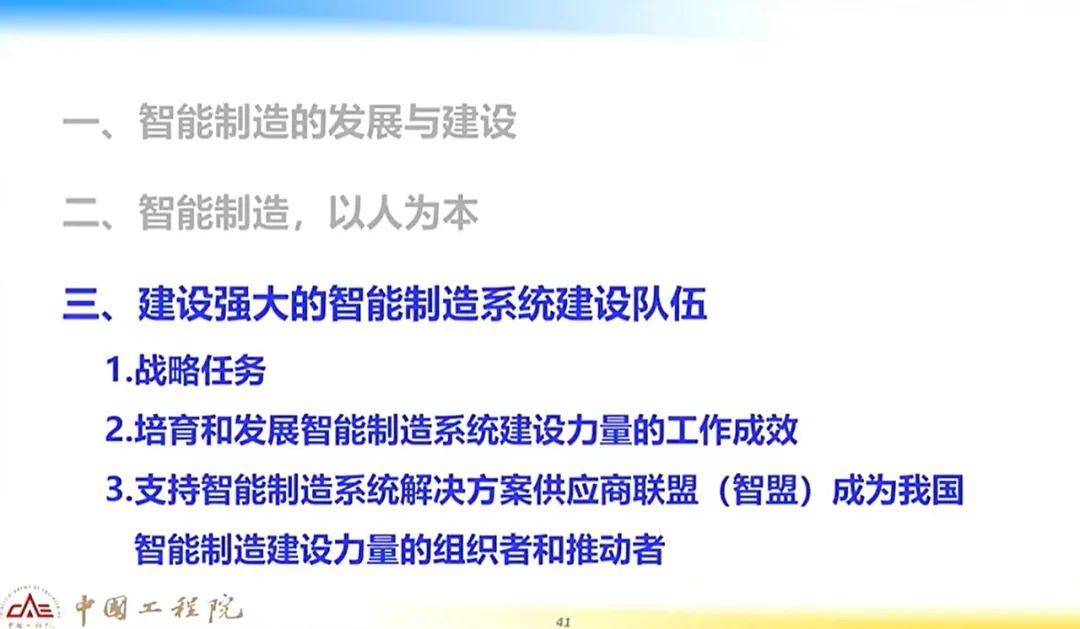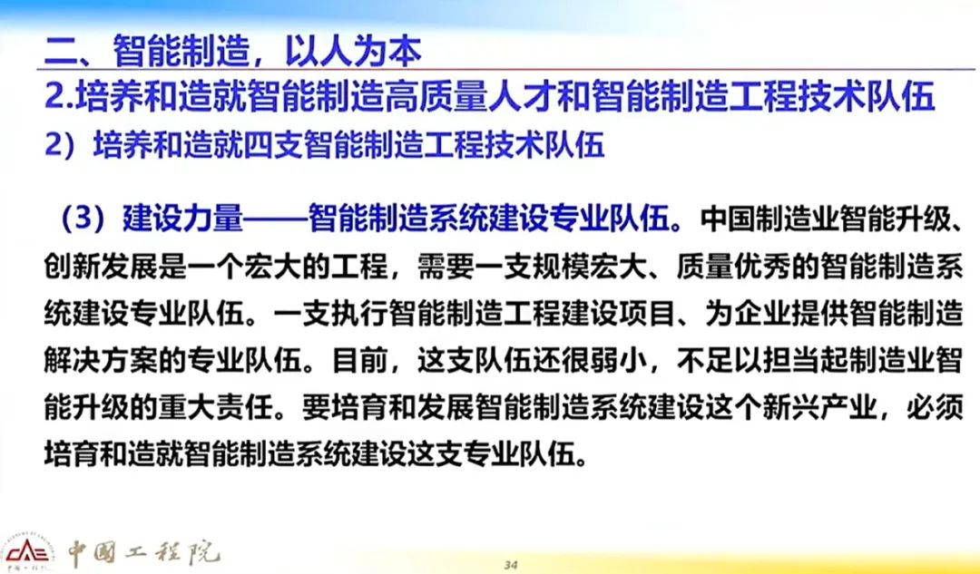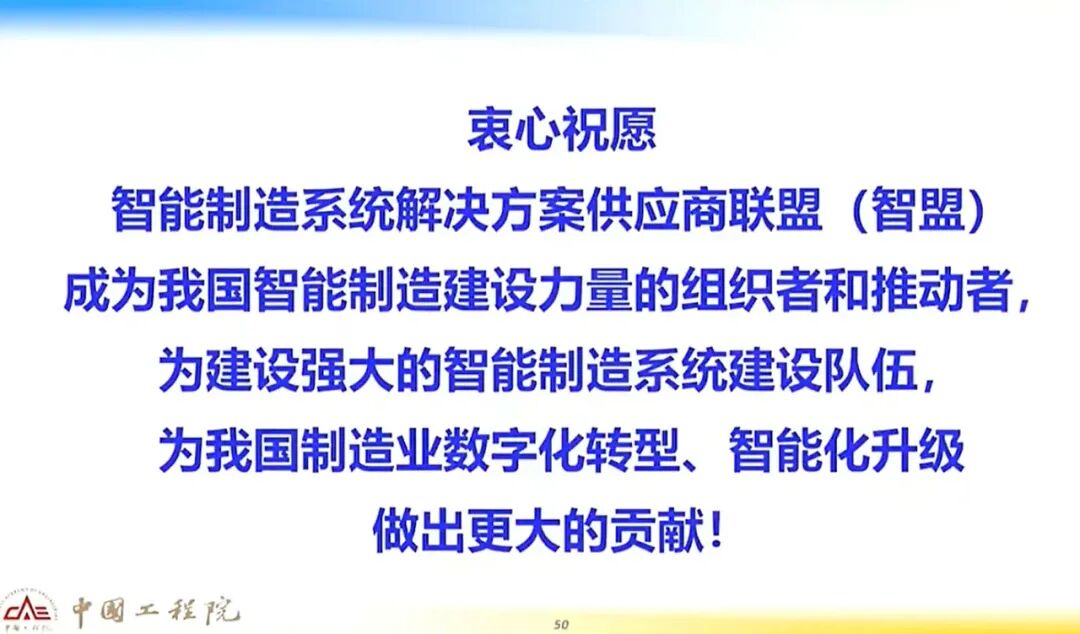 周济主任在《建设强大的智能制造系统建设队伍》主旨报告中强调,智能制造本质上是一个人-信息-物理系统,核心关键在于“人”,必须培养和造就智能制造高质量人才和智能制造工程技术队伍。他指出,解决方案供应商作为智能制造的主要建设力量、应用实施的重要推动者和自主供给的核心支撑,在智能制造发展中被赋予了重要使命。