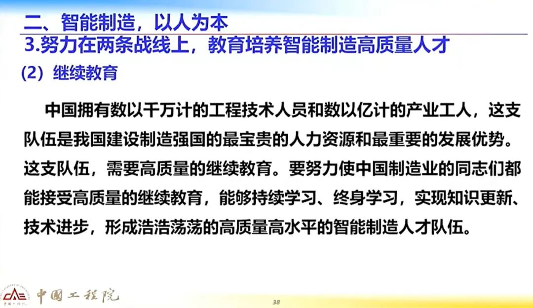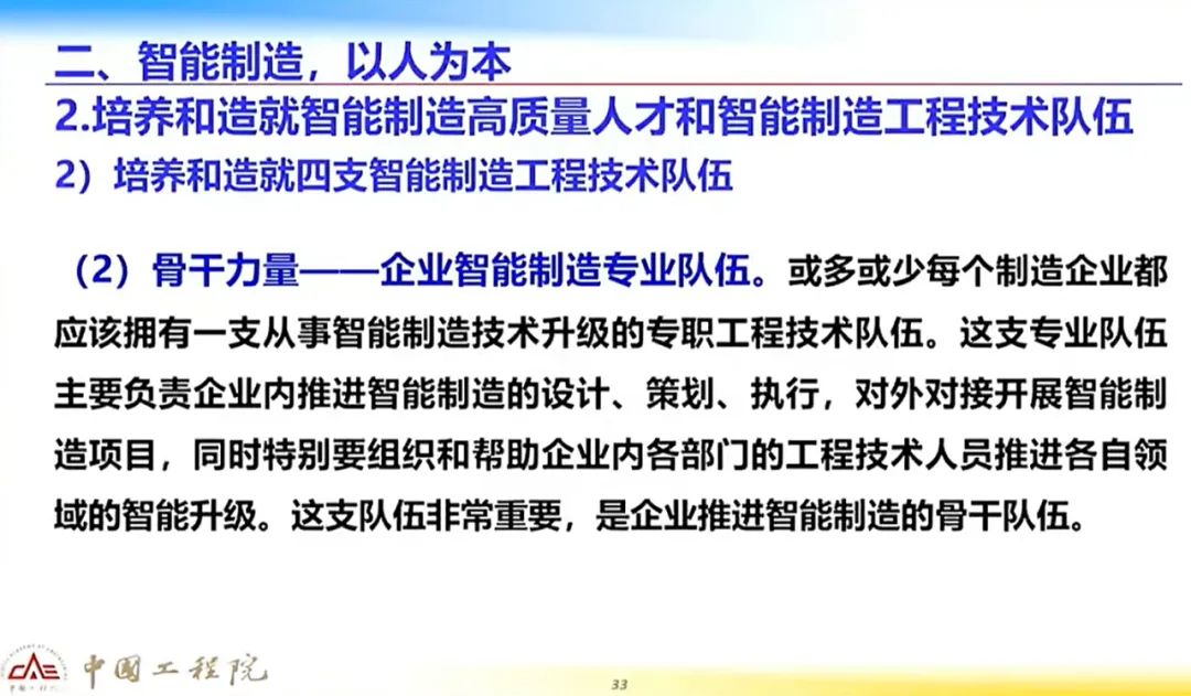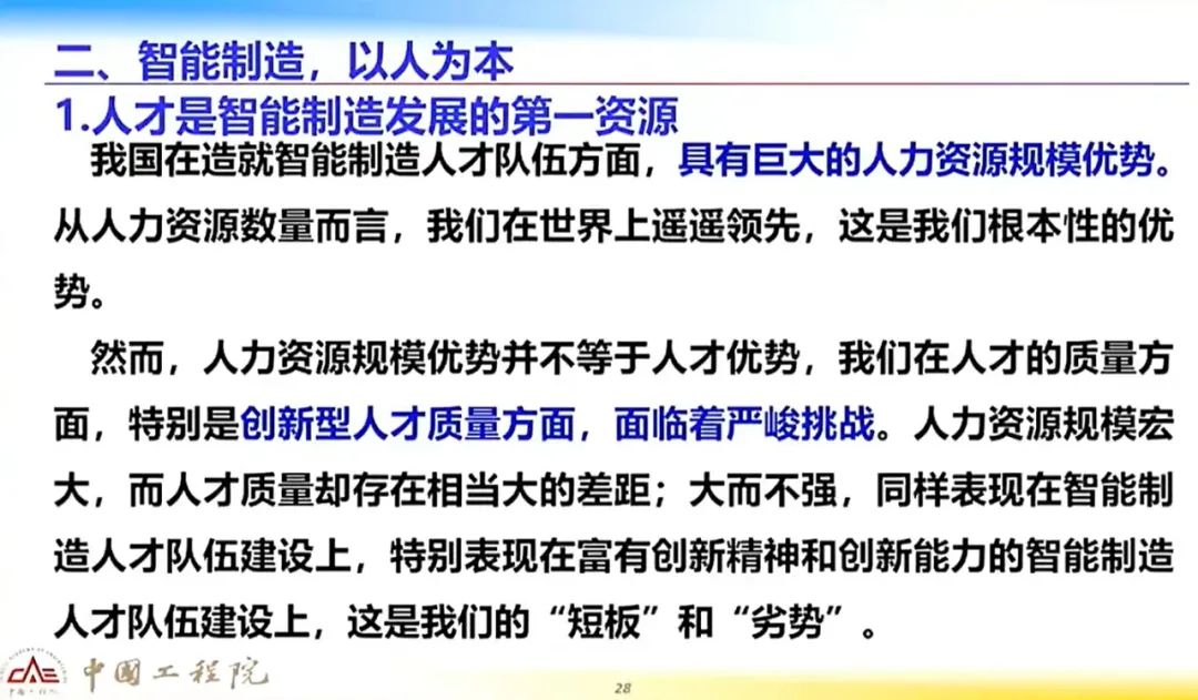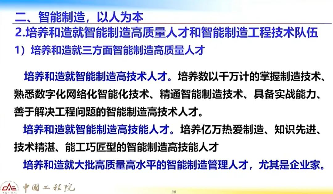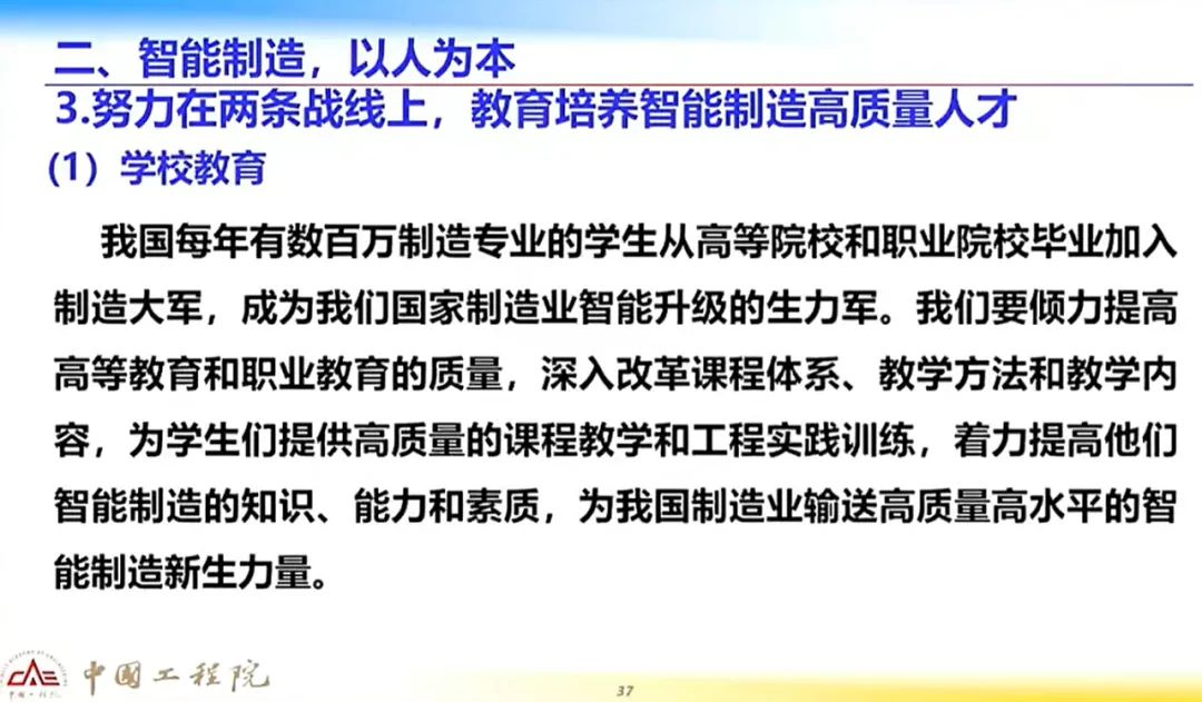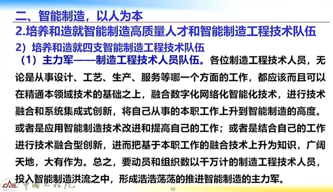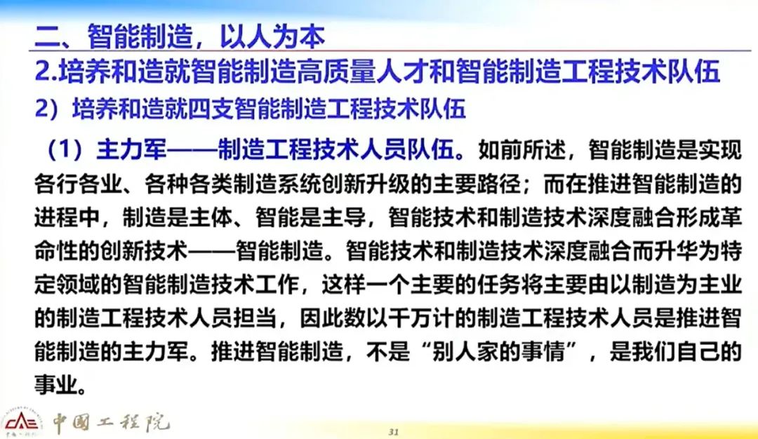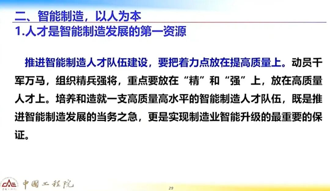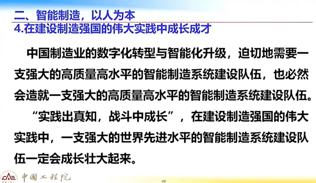 周济主任在《建设强大的智能制造系统建设队伍》主旨报告中强调,智能制造本质上是一个人-信息-物理系统,核心关键在于“人”,必须培养和造就智能制造高质量人才和智能制造工程技术队伍。他指出,解决方案供应商作为智能制造的主要建设力量、应用实施的重要推动者和自主供给的核心支撑,在智能制造发展中被赋予了重要使命。