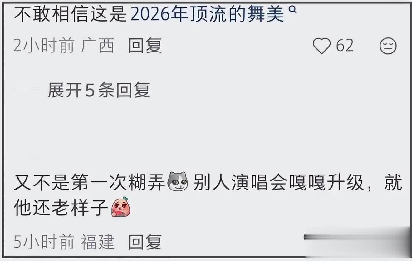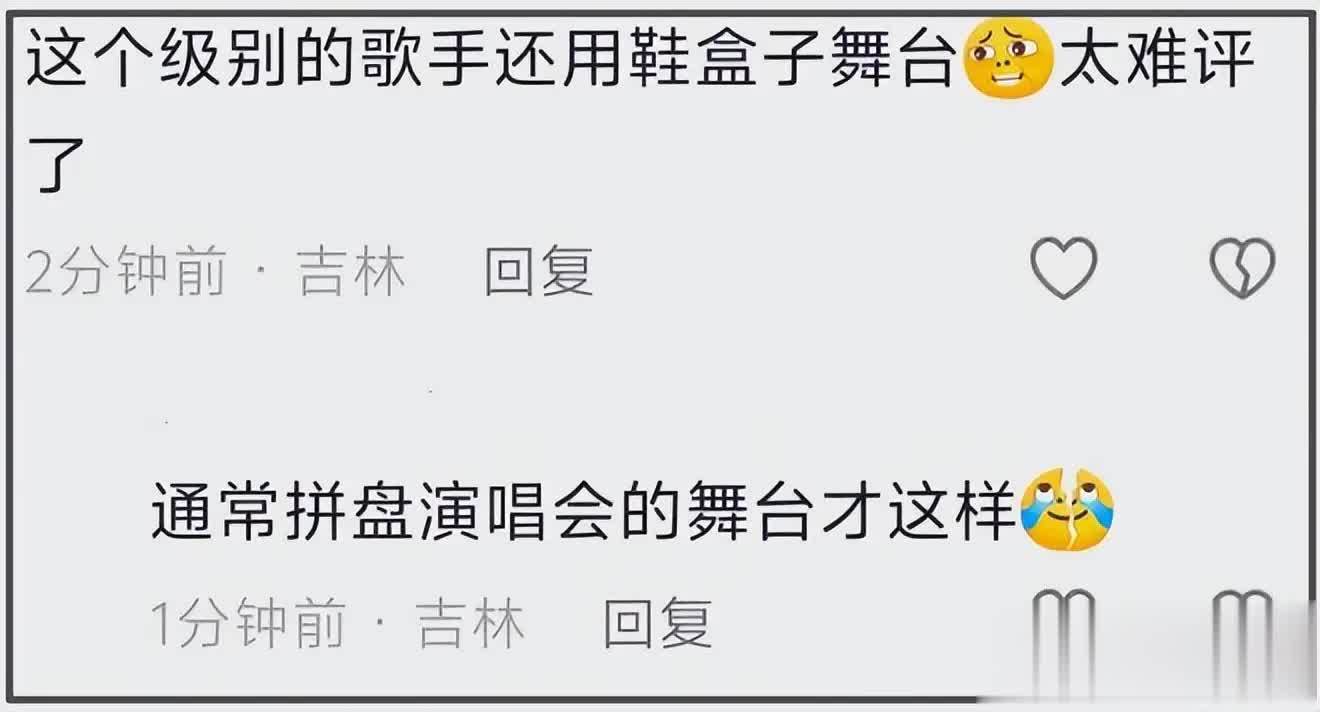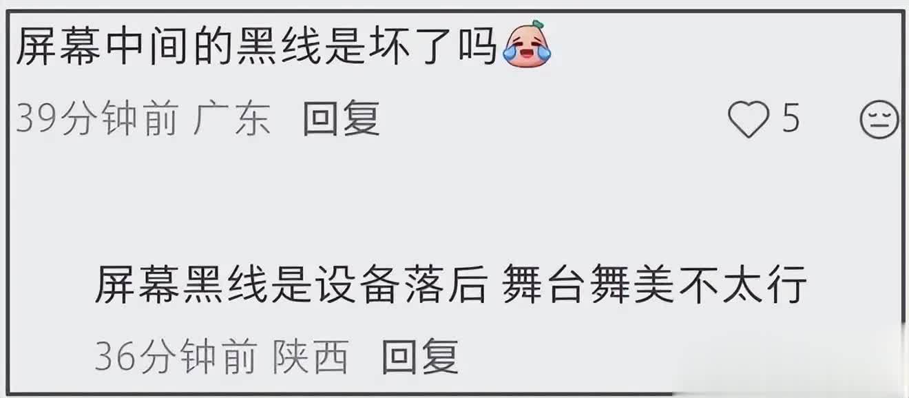 舞台前横亘着又粗又长的黑色线缆,硬生生把大屏幕割成好几块,视觉杂乱又粗糙。所谓的「顶级舞美」,被不少人吐槽「五年前的演唱会都比这强」「天王级别,拼盘配置」。