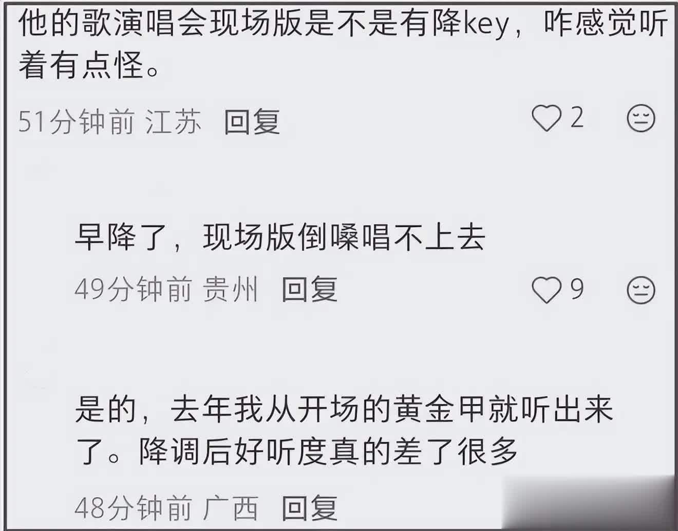 曾经清亮有穿透力的嗓音,如今变得沙哑含糊,早年能轻松驾驭的高音,现在几乎首首降调,一到副歌就习惯性把话筒递给观众,美其名曰「万人大合唱」,实则是躲高音、省力气。